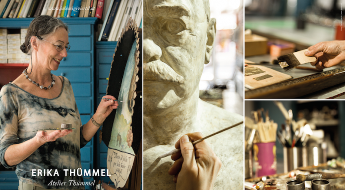 Open Studio im Atelier der Restauratorin Erika Thümmel. Auf dem alten Arbeitstisch haben sie sich alle fein gemacht: Der alte Rahmen strahlt wie nach einer Verjüngungskur in warmen rotgoldenen...